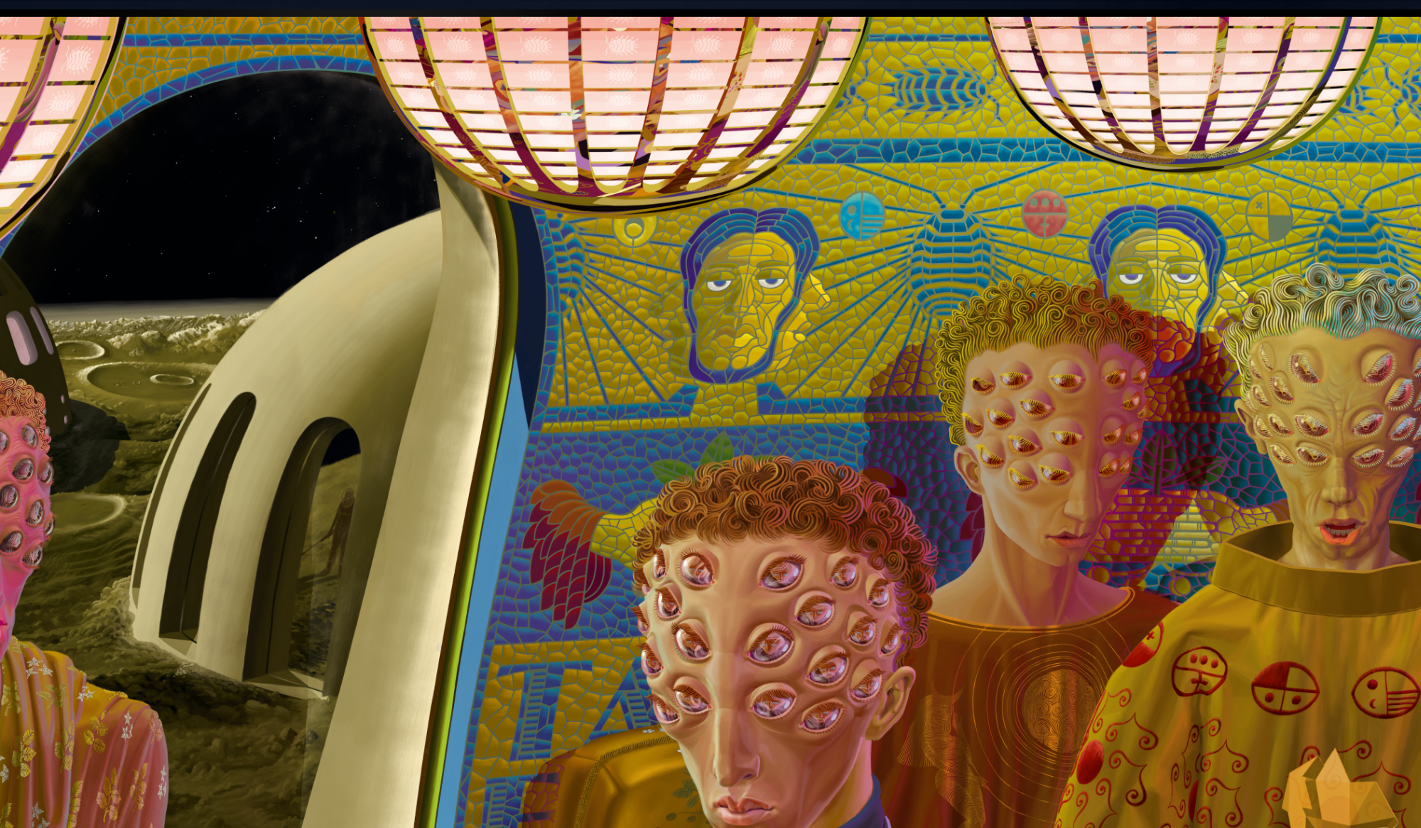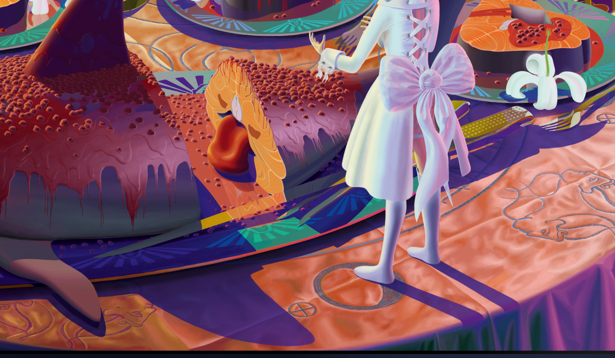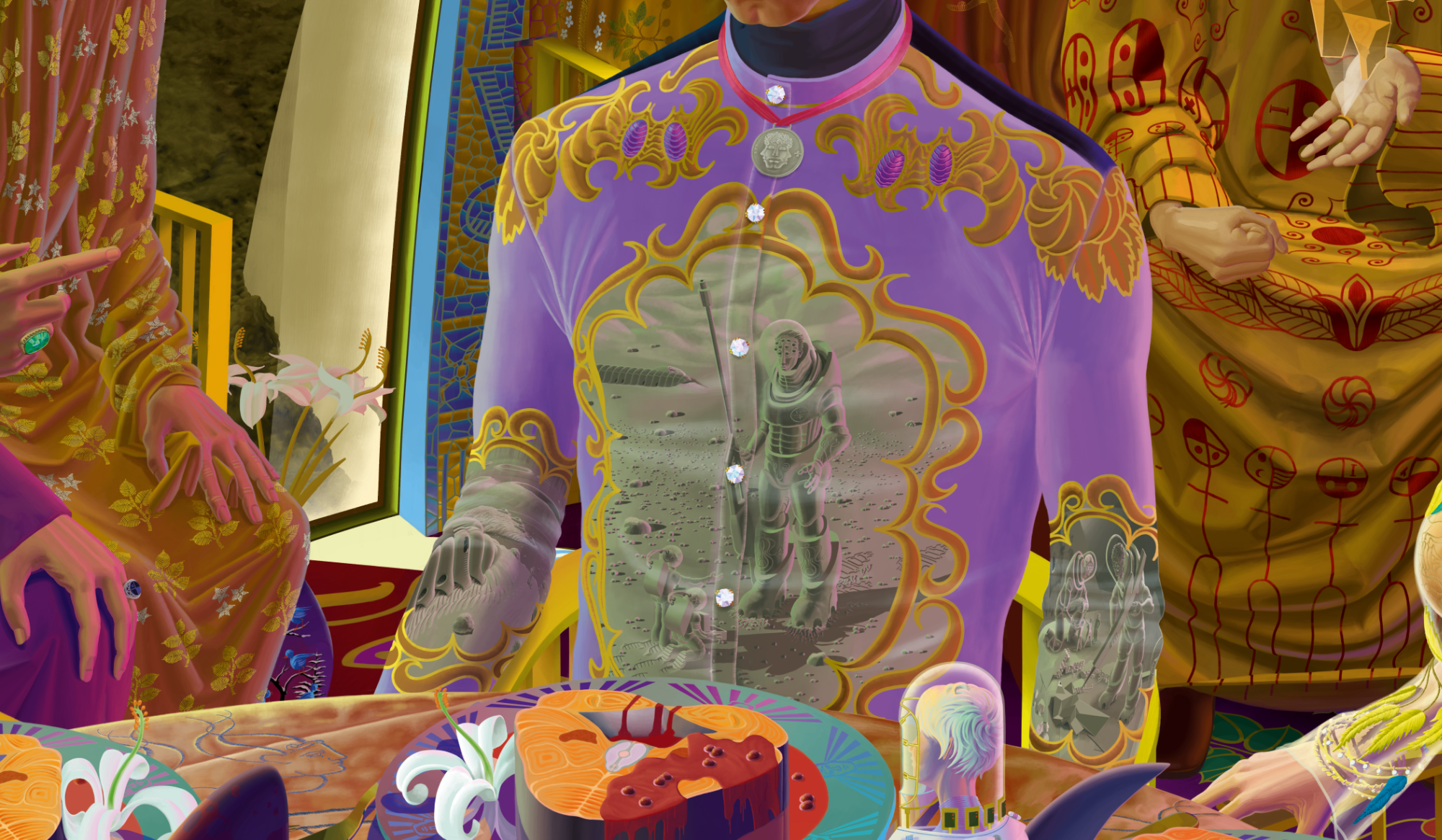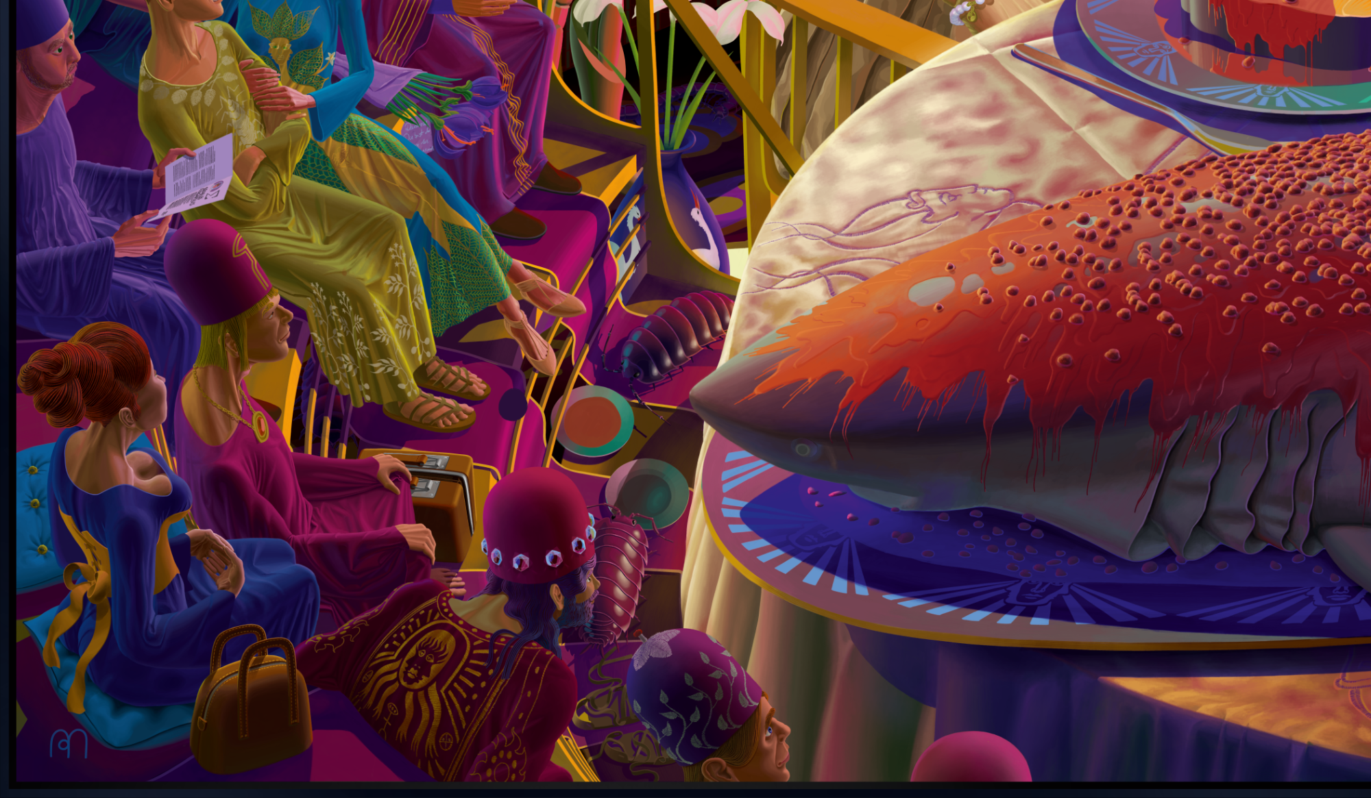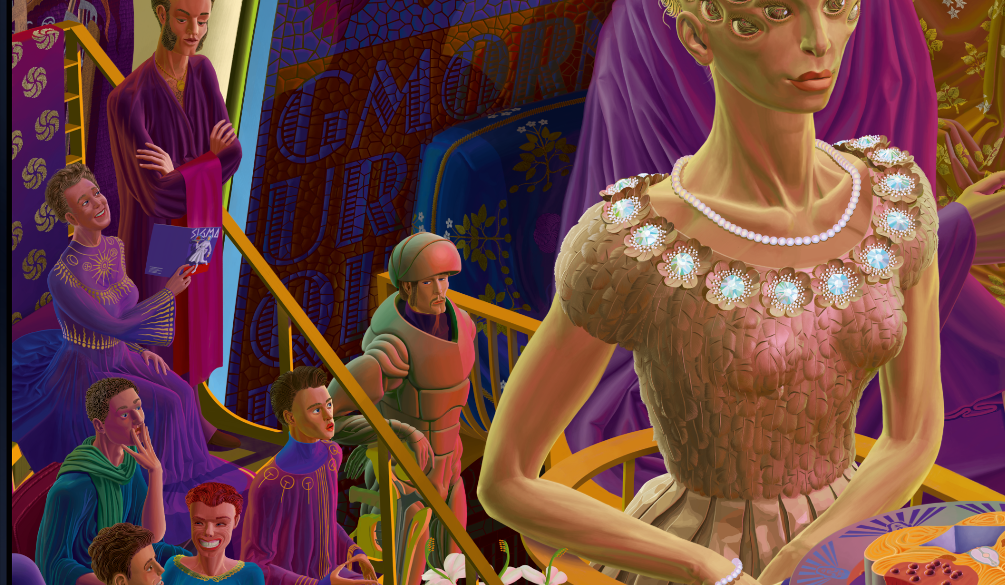 A jury of Multi-Ones - creatures with collective minds - are judging over a young woman's cooking abilities. It's the single most important picture in the 83-3 series from August Mond.